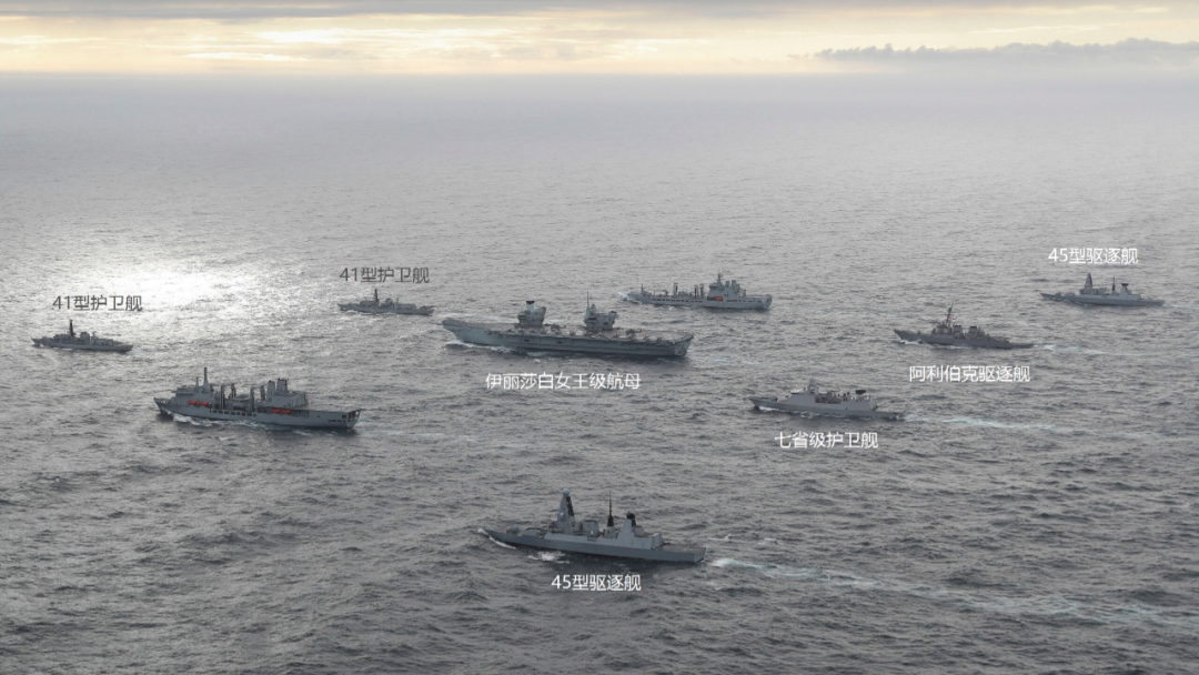 該航母戰鬥羣“配置非常豪華”,包括英國皇家海軍45型驅逐艦、美海軍阿利·伯克級驅逐艦,英國皇家海軍“諾森伯蘭”號和“肯特”號護衞艦以及荷蘭海軍“埃弗特森”號護衞艦。