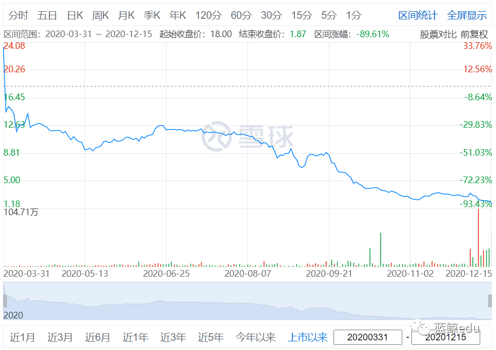 去年11月,美聯英語衝擊美股。獨立上市失敗後退而尋求借殼,但估值卻被打了八折。今年3月,美聯英語所屬的美聯國際教育科技集團完成與EdtechX公司的合併交易,正式以新實體Meten EdtechX登錄納斯達克。只可惜“上市即巔峯”,其股價一路暴跌9成。