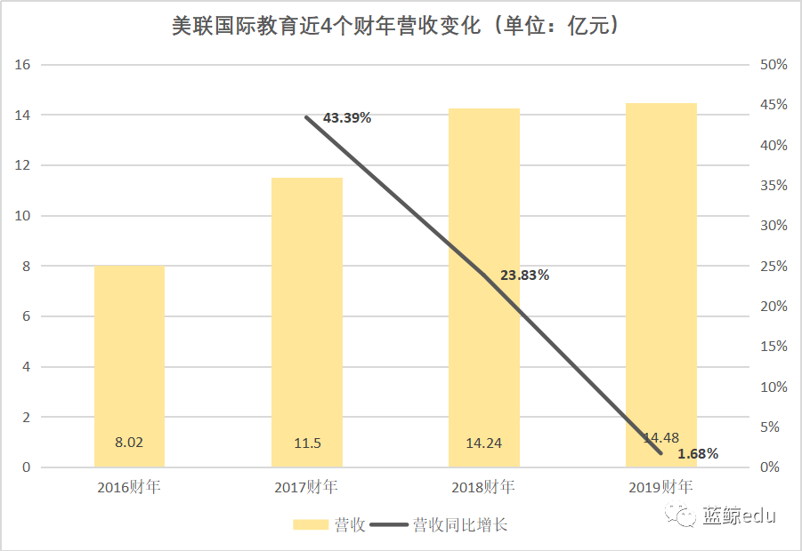 2017年-2019年,美聯國際教育的營收同比增長率直線下降,從43.39%一路降至1.68%。僅2019年一年,其營收增速就同比減少了超20個百分點。