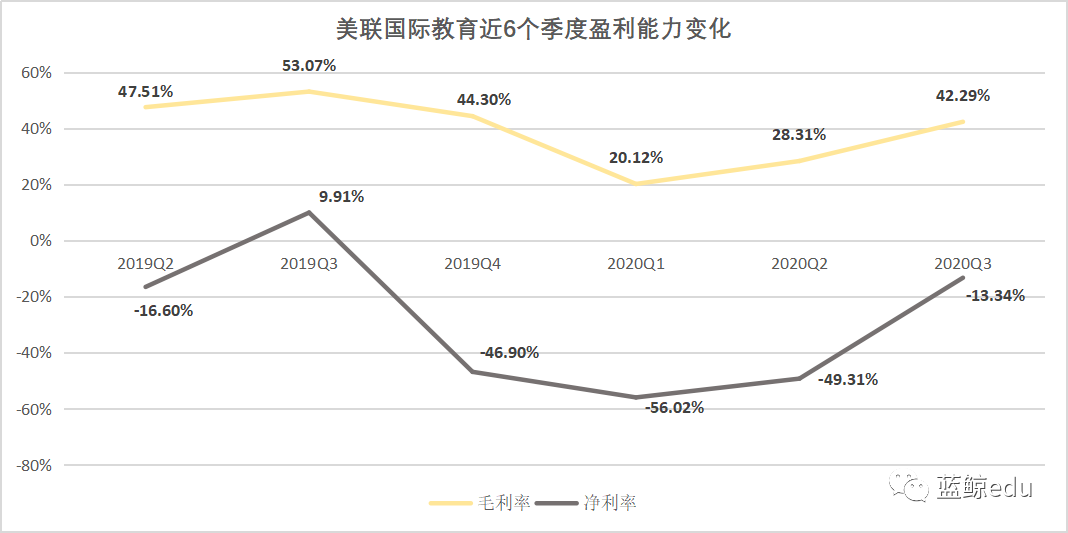 上市後的美聯國際教育的毛利率也陷入谷底,從2019年的45%左右大幅下滑到20%,三季度,美聯國際教育的毛利率雖然有所回升,但仍未達到去年的水準。