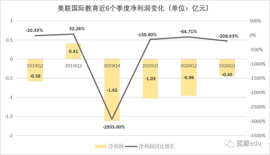 虧損情況同樣堪憂。目前,美聯國際教育已經連續虧損了4個季度。近6個季度,除2019年Q3外,5個季度淨利潤均為虧損狀態。其中2019年Q4淨利潤虧損達1.62億元,同比大幅下降近3000%。