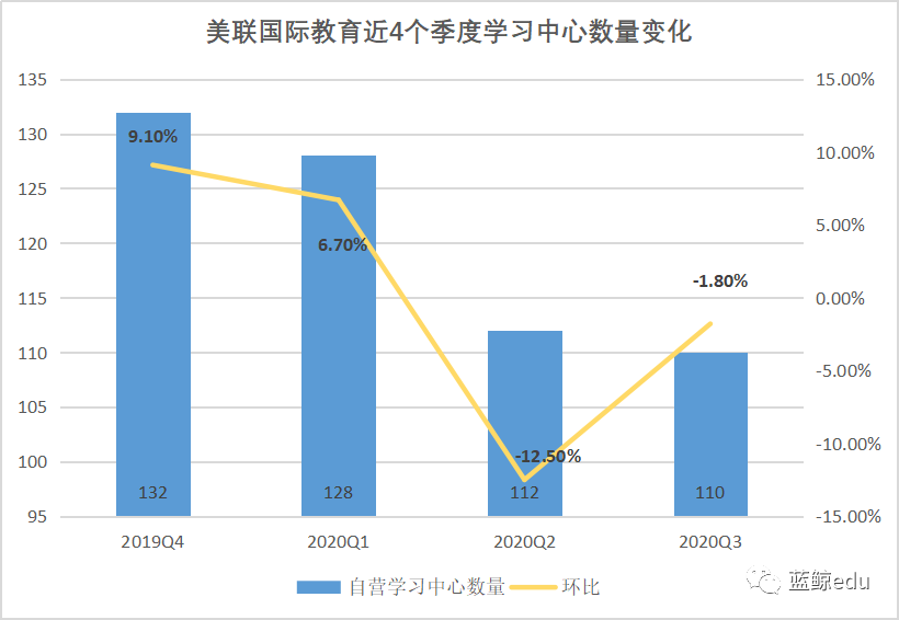 面對疫情衝擊,美聯國際教育處於戰略收縮狀態。最近四個季度,其學習中心數量持續減少。2020年Q3,美聯國際教育共有110個自營學習中心在運營,比去年年末減少了22家。