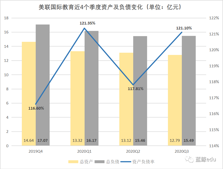近4個季度,美聯國際教育的總負債均遠高於總資產,資產負債率居高不下,最高時在2020年Q1達到121%,負債率最低時也超過了110%。這種狀態從2016年持續至今。