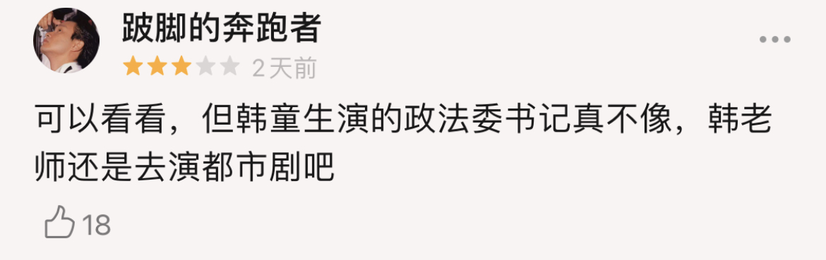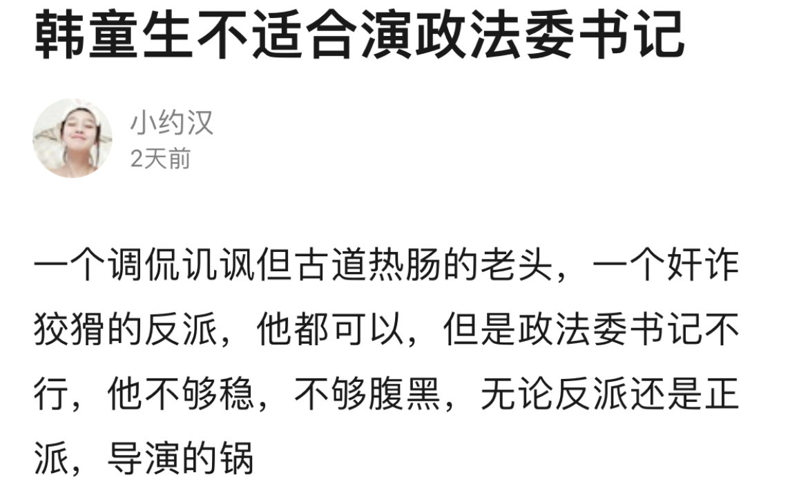 但最受質疑的,還數扮演東川省政法委書記的韓童生。