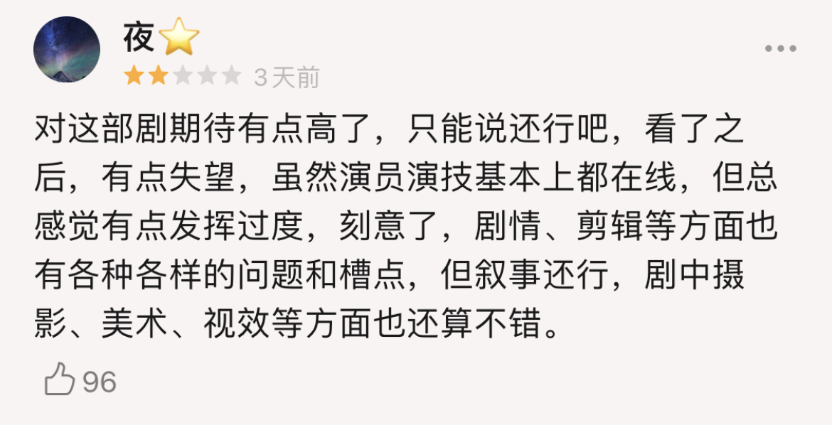 搜了搜各路評價,發現觀眾的不滿主要集中在了四方面:部分角色演技拉胯**、情節不合理、拍攝手法差、廣告太出戏。**