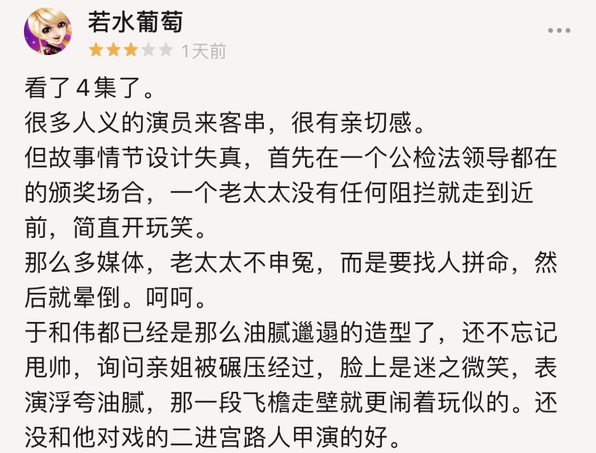 這畢竟是一部打着“檢察法治劇”旗號的行業劇,連本劇貫穿始終的最大“懸案”都這麼立不住腳,難免會引起不滿。