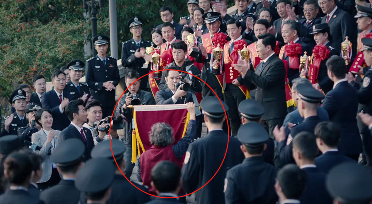 還是開頭那場,老太太翻個錦旗,愣是翻了半分鐘,一直在慢動作、切景: