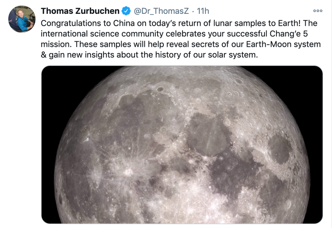 除了外媒,美國航空航天局科學任務部門高級官員托馬斯·楚比興也在社交媒體上祝賀中國嫦娥五號安全返回。他説,“國際科學界慶祝嫦娥五號成功完成任務。這些樣本將有助於揭示地月系統的秘密,並增進對太陽系歷史的瞭解”。