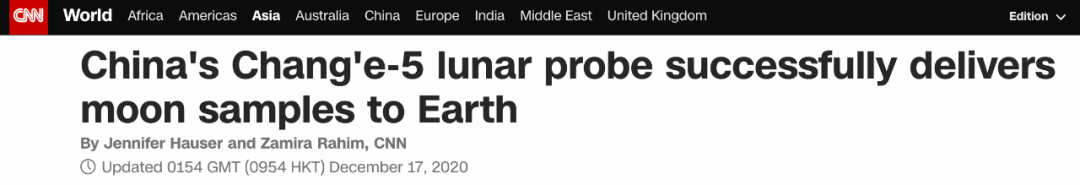 美國有線電視新聞網(CNN)報道稱,中國的嫦娥五號成功運回月球樣本,中國也成為世界上第三個成功從月球收集樣本的國家。