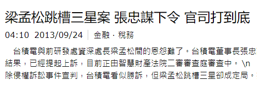 2013年6月,一審台積電雖然勝訴,但沒能阻止梁孟松履職三星。