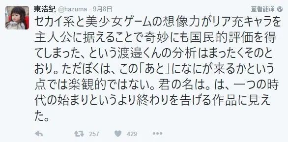 在“世界系”方面關於該作最著名的短評,莫過於最早對“世界系”此進行權威定義的評論家 東浩紀 在推特上的評論 (現已刪除) :《你的名字。》,與其説是一個時代的開始,不如説是宣告了一個時代終結的作品。