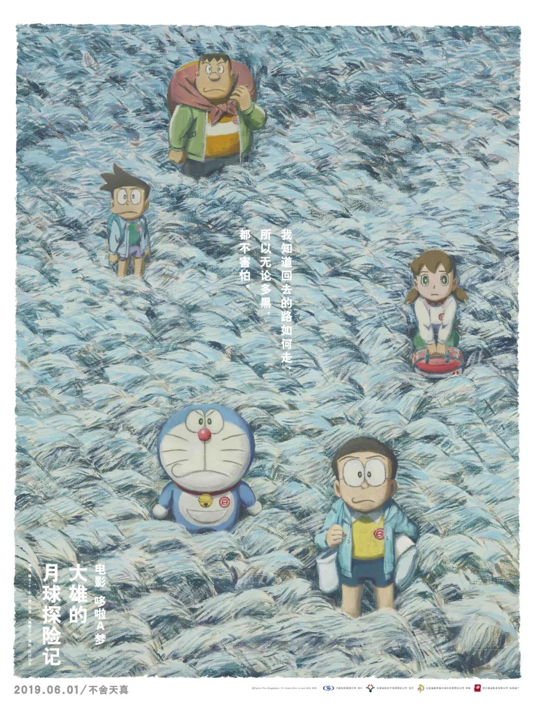 其中一款海報的標語如此寫道:“我知道回去的路如何走,所以無論多黑,都不害怕。”而畫面則是大雄一行人舉頭望着月亮的方向,而他們所站的地方是象徵着地球與故鄉的蘆葦田裏月光撒亮了大地。這是一個關於少年少女們“出走”的畫面,與標語的“歸來”形成了對應。