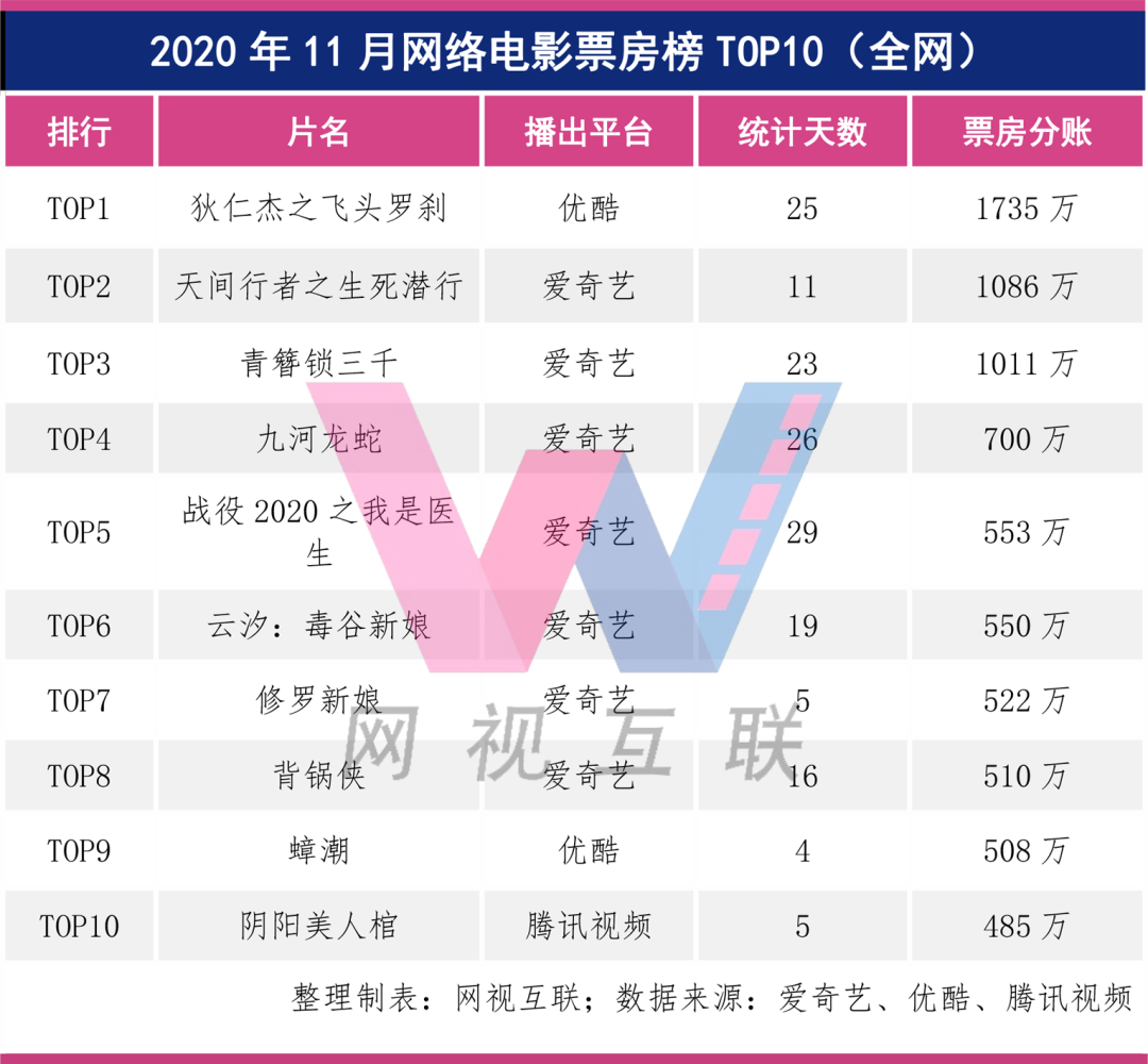 根據愛奇藝、優酷、騰訊視頻公佈的相關數據,網視互聯(wxs360)整理出了11月網絡電影票房榜TOP10。其中,有3部網絡電影票房破千萬,愛奇藝2部,分別是《天間行者之生死潛行》1086萬、《青簪鎖三千》1011萬;優酷1部,為《狄仁傑之飛頭羅剎》,票房1735萬。