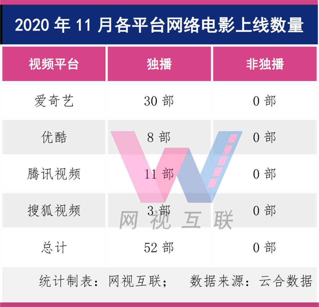 值得一提的是,11月份上線的52部影片全部為獨播影片,非獨播影片數量為零。