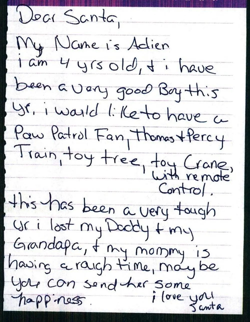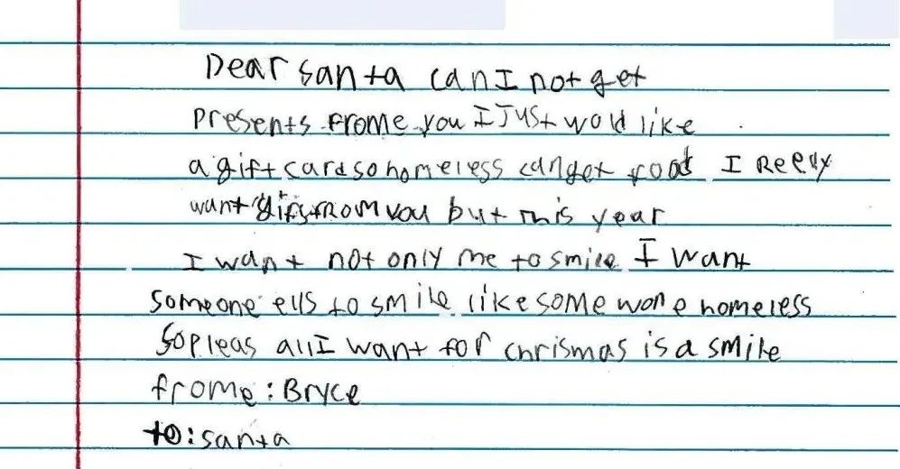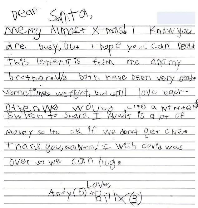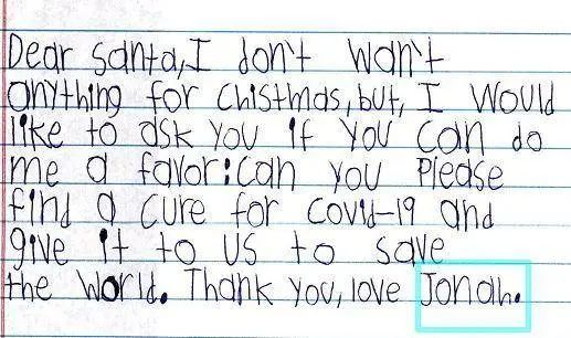 孩子們的聖誕願望或大或小,有人想要玩具,有人想要一張賀卡,也有人只想要一個擁抱,還不忘囑咐聖誕老人帶口罩和手套……