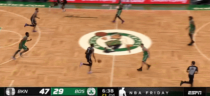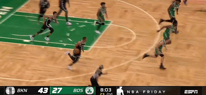 最標誌性的是第二節中段:8分鐘的時候,布朗從底線借兩個掩護切出到外線投三分,杜蘭特盡力追出去幹擾,然後頭也不回地朝自己的半場狂奔。