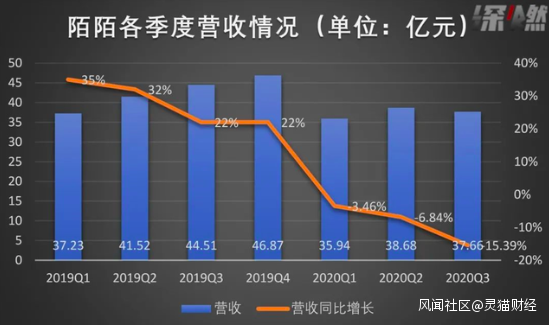 儘管是直播把陌陌從當初的深淵給拉了上來,但是直播並沒有完全救了陌陌,還是在懸崖的邊緣。根據陌陌發佈的2020年第三季度財報顯示,陌陌營收37.66億元,比去年同期下降了15.4%,淨利潤更是下滑的嚴重,4.56億元的淨利潤比起去年同期下滑48.9%。僅如此,數據顯示,截至2020年9月,陌陌月活用户達1.136億,而2019年9月為1.141億。按理説,今年疫情促進了直播行業的發展,直播帶貨更是成為風口,而有直播業務的陌陌營收卻不升反降,用户數量上也一直沒能突破增長瓶頸。
