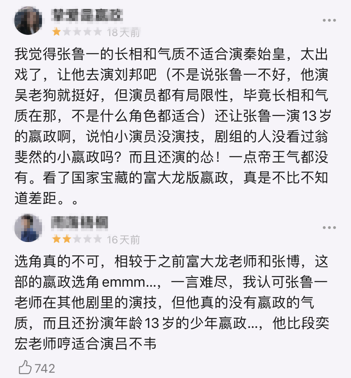 觀眾對張魯一的不滿多集中在:“毫無帝王之氣”,撐不起來這個角色;40歲的人還要扮演一段13歲的嬴政,“太違和”。