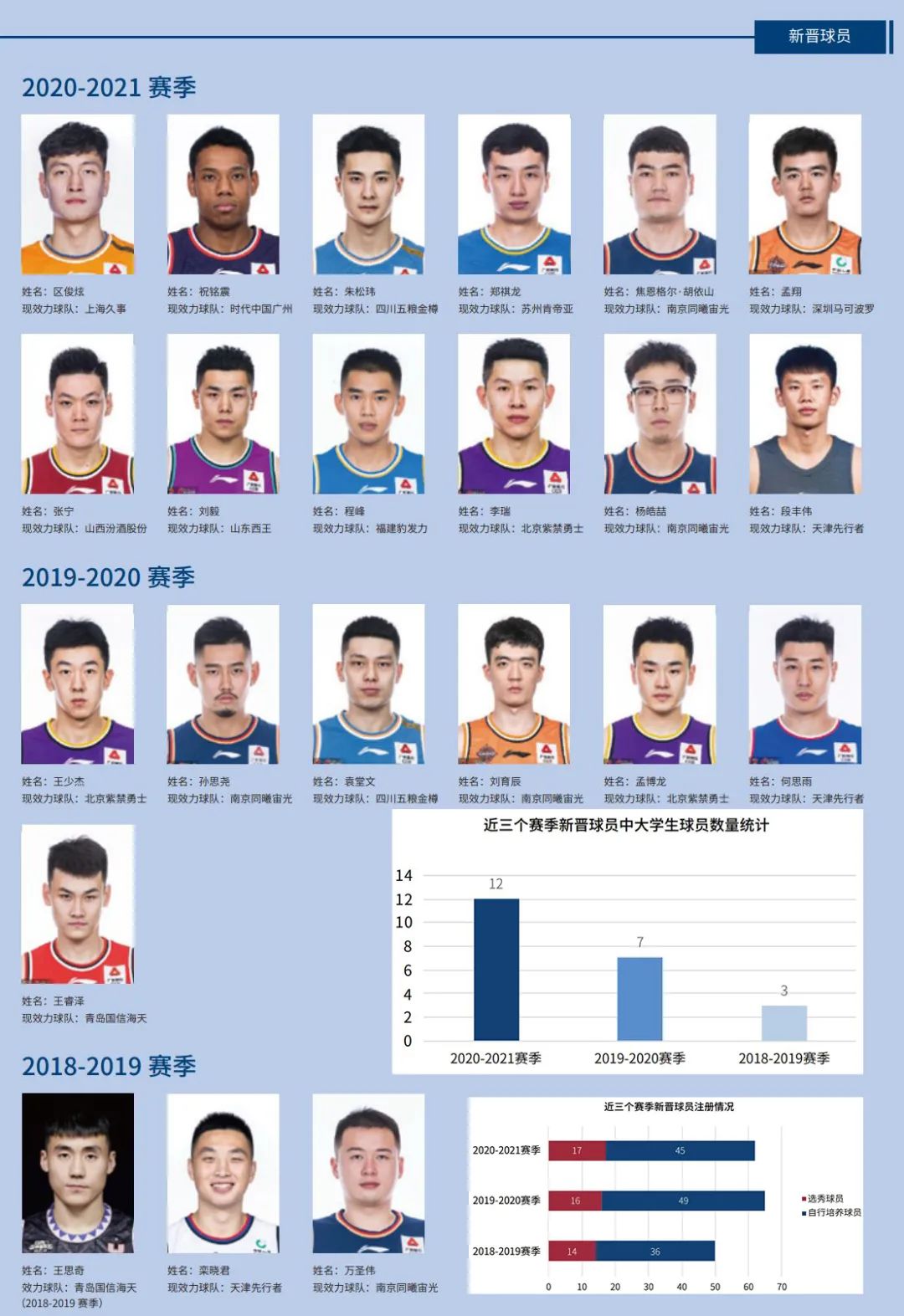 大學生球員越來越受俱樂部青睞,正在成為一種現象,即將變成一股勢力。根據剛剛發佈的《CBA國內球員基礎信息白皮書》:2020-21賽季的新晉球員中,共有12名大學生球員在選秀大會上被選中(其中含一名海外大學生球員);近三個賽季,新晉球員中大學生球員數量呈顯著上升趨勢,與2018-19賽季相比,新賽季新晉大學生球員註冊人數增加了9人,增長率300%。