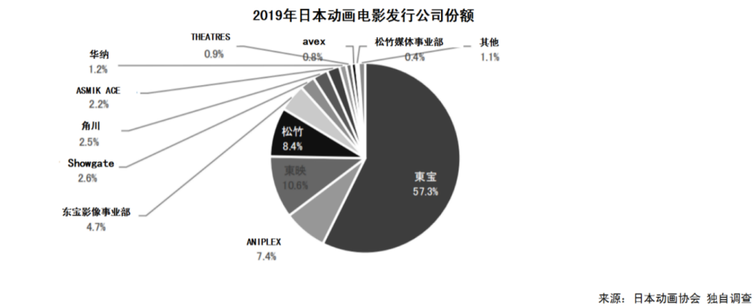 從19年日本動畫電影的票房收入來看發行公司的份額,東寶和東寶影像事業部加起來佔了全體的62%。之前提到的經典系列**(如《柯南》《寶可夢》《哆啦A夢》《蠟筆小新》)**的電影發行,一直由東寶負責。而且東寶會定期對吉卜力、新海誠導演作品、細田守導演作品這些大型作品進行投資。