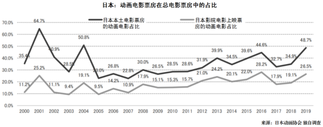 2000年以後除了動畫片以外,包含日本和海外的真人電影在內的日本電影市場本身就在擴大。日本電影票房全體從2000年到2019年的增長率為52%,而2010年到2019年的增長率為18%。儘管如此,與這些數字相比,日本動畫電影市場的增長率遠超過日本電影市場。