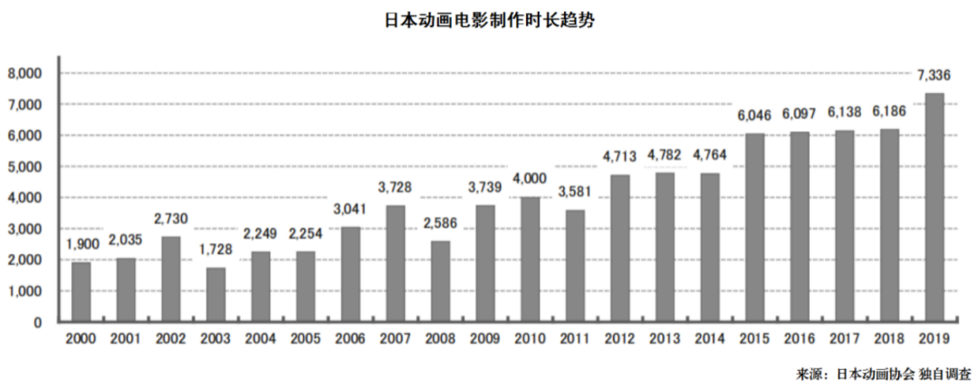 而且,與動畫片的生產力緊密相關的製作時長也更為顯著。2000年動畫電影時長不過是1900分鐘,到了2009年約實現了100%的增長,達到了3739分鐘。這個數字一直在增加,直到2019年創下了歷史新高,達到了7336分鐘,同比增長18.6%,約是2000年的4倍。