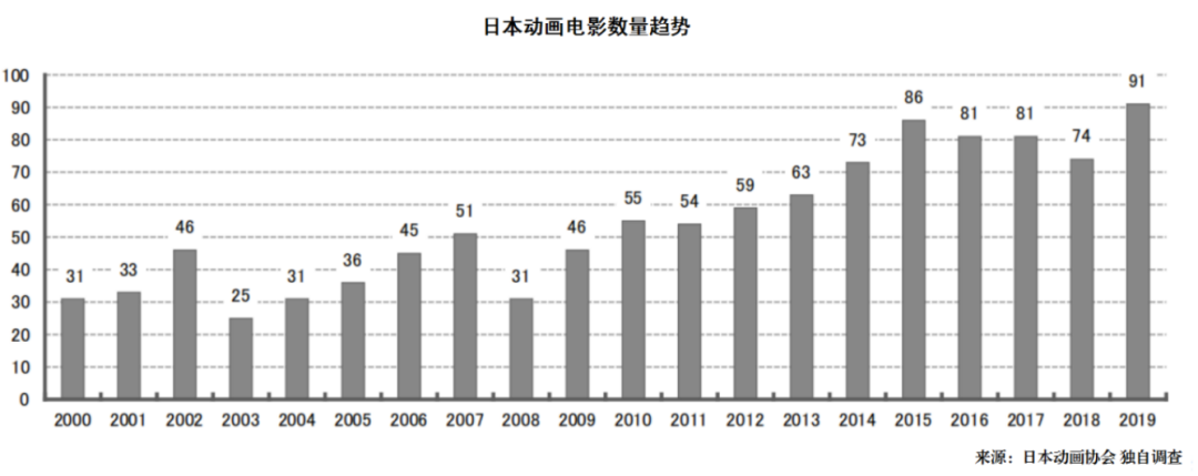 動畫電影的票房收入增長,給動畫製作帶來了巨大的影響。作品數量自2000年以來有着上漲的趨勢:2000年31部,2007年首次超過50部,2013年超過60部,2015年達到了86部。