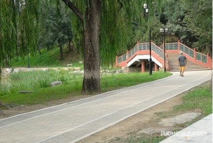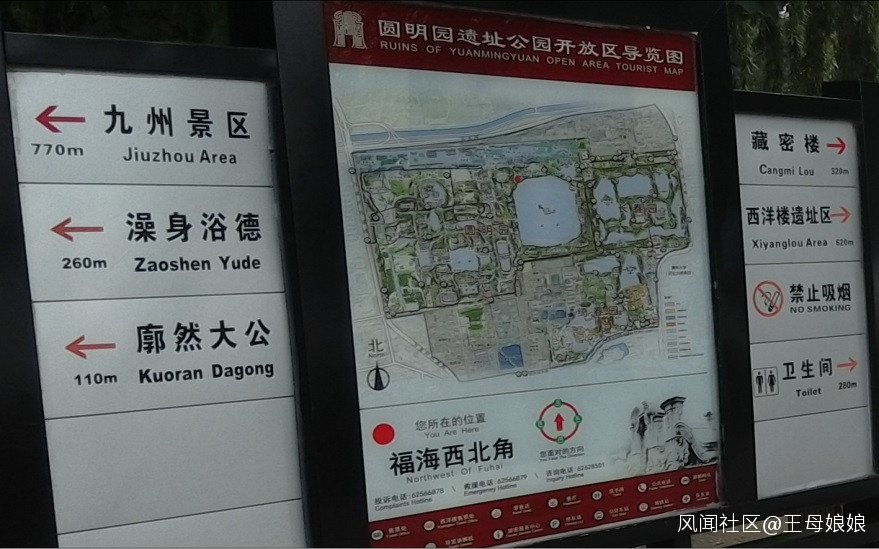 上面是遊覽圓明園過程中所拍,從東~西,福海西北角景象。過橋後,前面是+綠化樹木約2~3層樓高土坡(自然區隔)丁字路口。向北、右手看不到景點,向東、向南,都是沿福海行進。遊客極易產生路徑依賴,順着此前觀景場景繼續……由此錯過下圖:最近走入圓明園主體機會(錯失>50%遺址公園)!