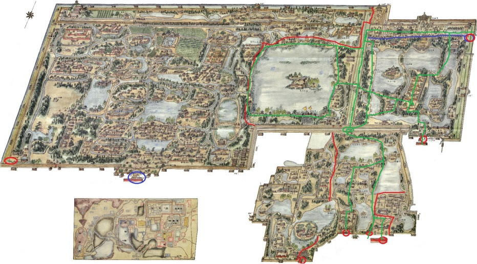 右上藍線以上區域:現在圓明園遺址公園最著名景點→西洋樓遺址。這一被公眾當成“圓明園”區域,實際只是圓明三園中,長春園(乾隆所建)北部+建景點,只佔圓明三園面積2%(現實殘垣斷壁比重最高)。多年來,公眾去圓明園遺址公園旅遊,實際是走下圖綠線。