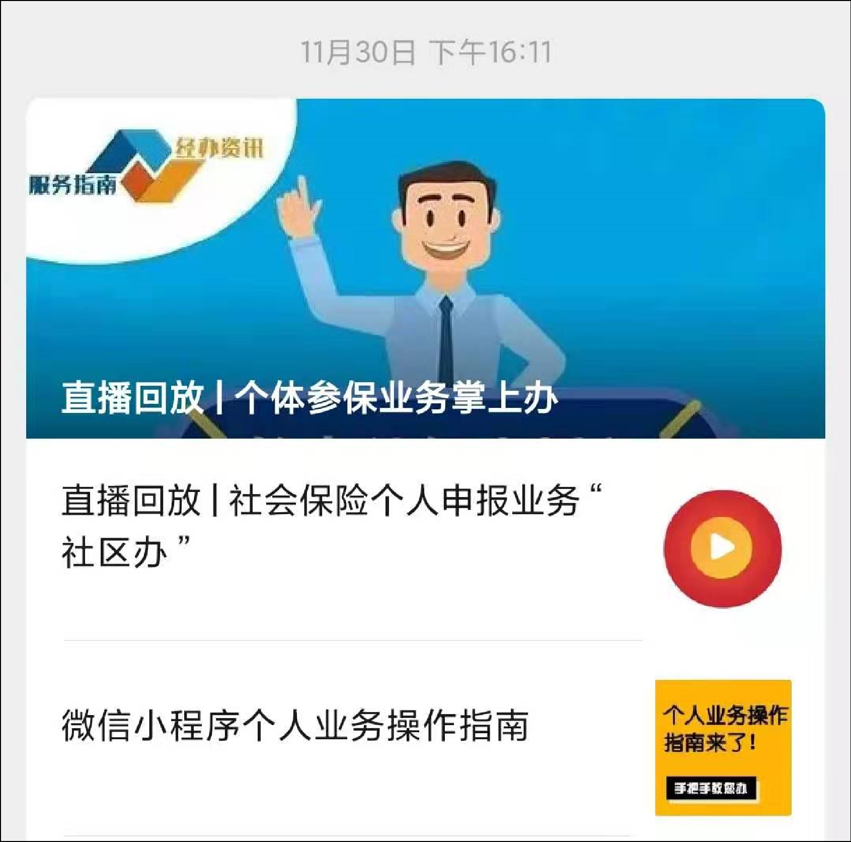 此外,該公眾號在11月30日還發布了“微信小程序個人業務操作指南”和“個體參保業務掌上辦”的直播視頻回放。