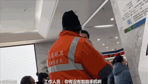一位姓卞的環衞工人來補繳社保,工作人員表示,他的業務微信小程序就能辦,並在現場教他操作。卞先生卻説,“來都來了,還是等叫號吧。”