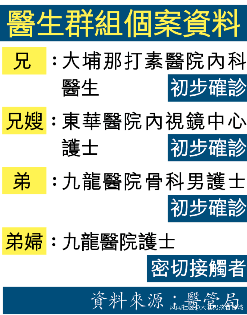 據香港《大公報》等媒體報道,17日晚,九龍醫院骨科的一名男護士確診感染新冠肺炎,其兄長及大嫂分別是大埔那打素醫院的內科醫生、東華醫院內視鏡中心護士,也先後在18日早確診。