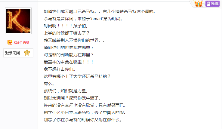 “為殺馬特收集1w句殺馬特滾出中國。”