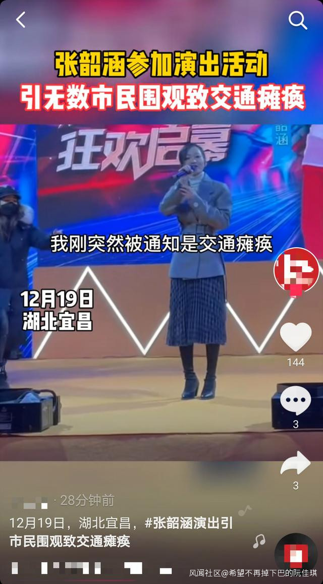 12月19日晚,湖北宜昌某商家開業,請來當紅明星張韶涵表演助興。