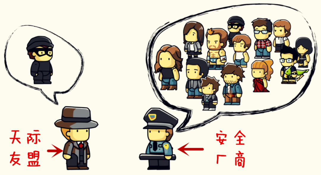 具體操作方法是醬的:建立一個聯盟,安全公司們把他們收集到的數據脱敏之後以合規的方式傳給天際友盟,天際友盟根據這些數據改進自己的情報,再交回給這些安全設備使用,提高他們的防禦水準。