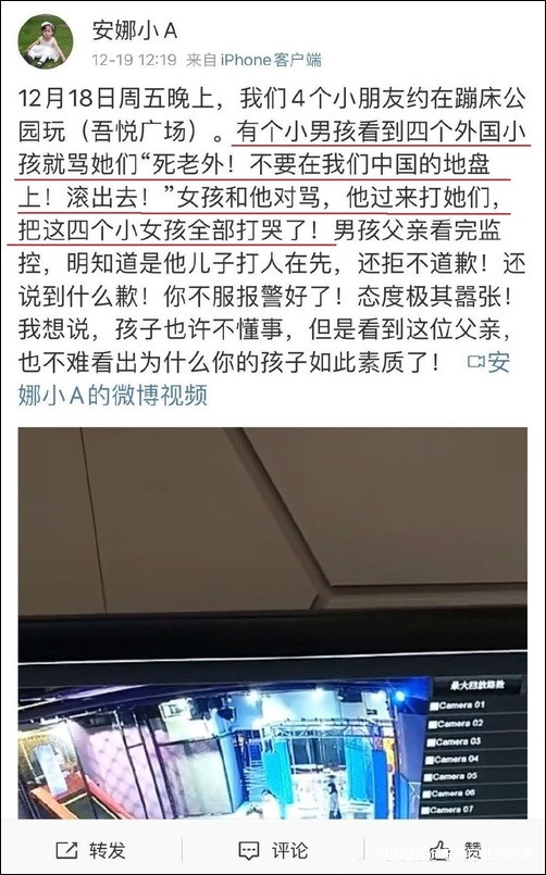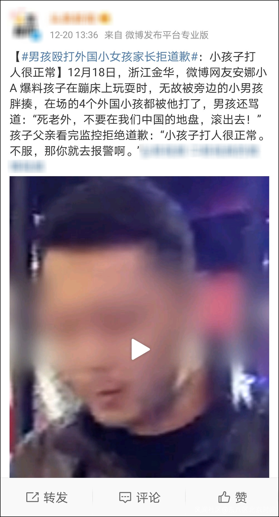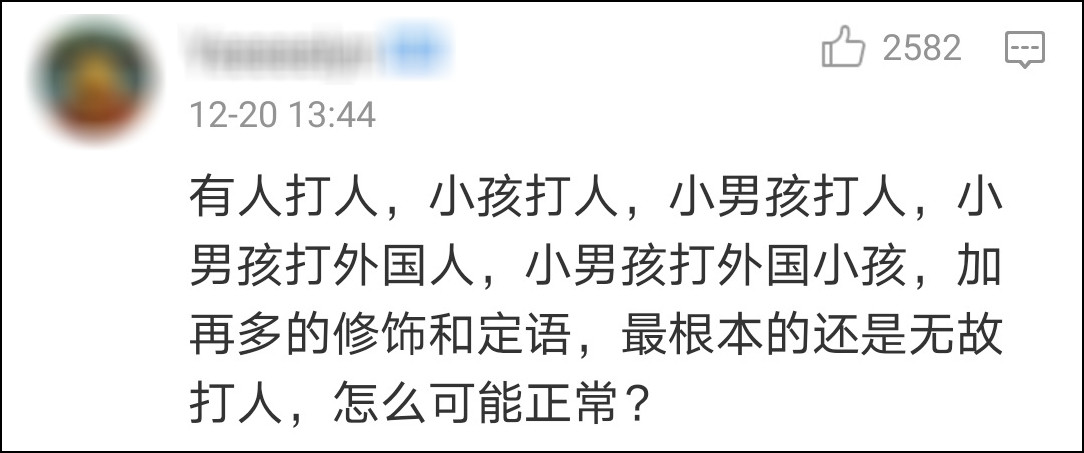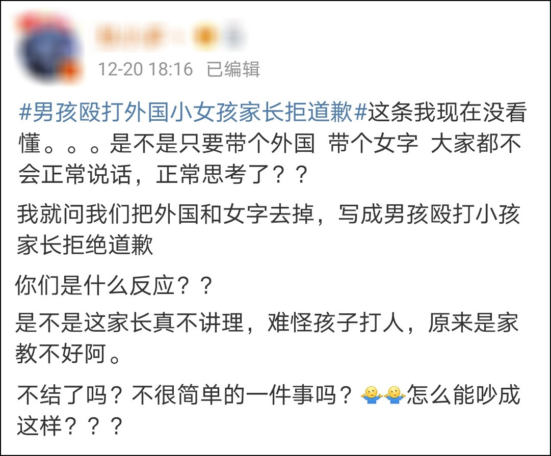 12月20日,微博上出現了一個熱搜話題#男孩毆打外國小女孩家長拒道歉#,網友們在這個話題裏大打口水仗。