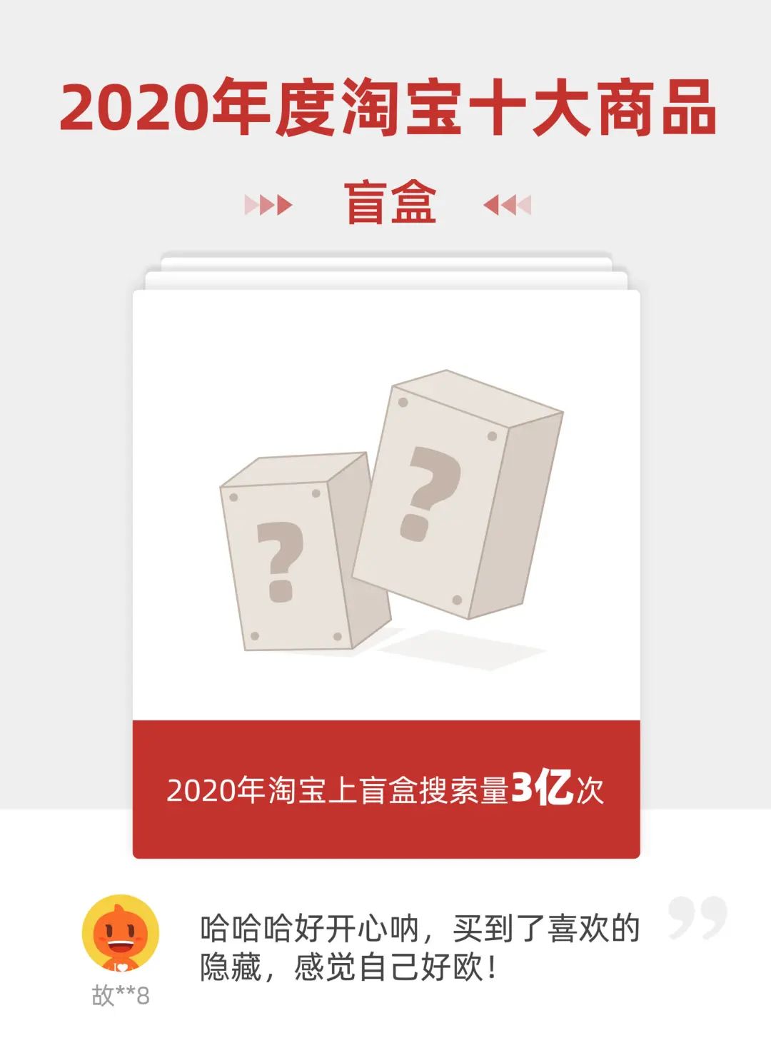 2020年,淘寶上盲盒搜索量3億次,吊打奧特曼的數據0.5條街 。