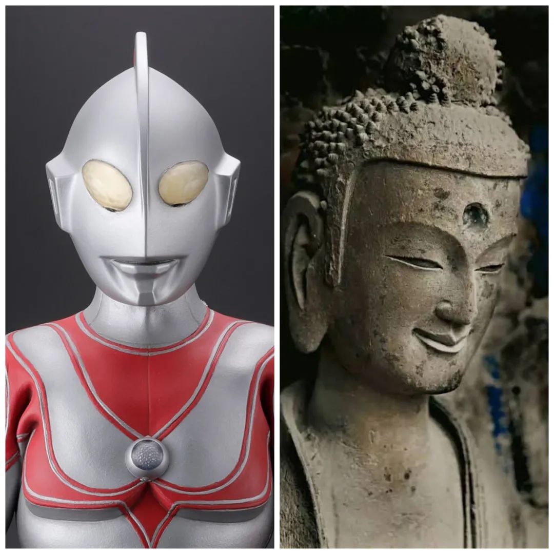 奧特曼頭部造型的靈感就來源與此,**他不僅融合了佛像中含蓄微露的美感,更突出了古典式的颯爽之笑,似石窟佛像一樣俯察大地。**俯視時帶來壓迫,仰視時,則似述哀愁。