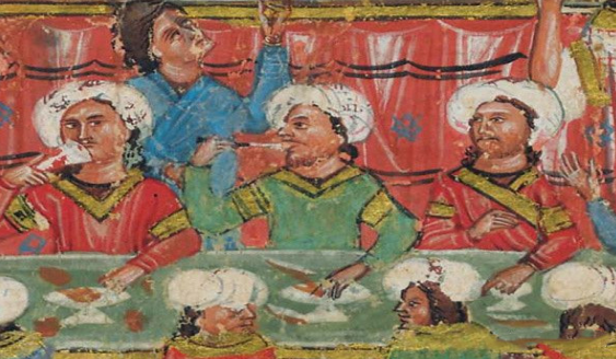 拜占庭帝國還有一個著名的吃飯風俗,那就是尊貴的主人和賓客要側卧就餐。這是從羅馬帝國時代流傳下來的風俗,地位較高的男子在宴會上可以倚靠在長枕上側卧着就餐,女人和等級較低的男人則以坐立的姿勢吃飯。到十字軍東征時,這種習俗已經只在宮廷流傳,變成了皇帝的特權。