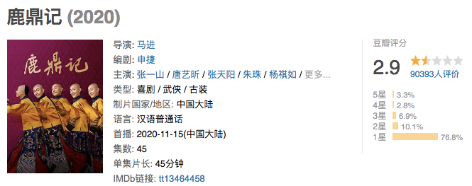 比如,2017年貢獻“摳圖”醜聞的《孤芳不自賞》,收穫至高關注度的同時的,豆瓣評分跌至3.0,淪為影視圈負面案例;爆火的由楊冪、黃子韜主演的《談判官》,收視率闖入2018年電視劇年度前十陣容的同時,豆瓣評分也僅達到3.5分……此外,還有今年華策克頓製作的新版《鹿鼎記》,幾乎都在不同時間段收割市場第一爛劇的口碑陣營。