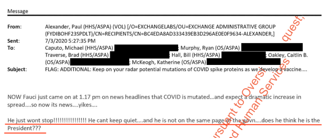 亞歷山大還在郵件中攻擊傳染病專家福奇稱:“別讓福奇説話,他把人們搞糊塗了。他太過隨意地傳遞信息,觀點前後不一。他就是不肯停下來,不能保持沉默,不能和政府的步調保持一致,他以為他是總統嗎?”