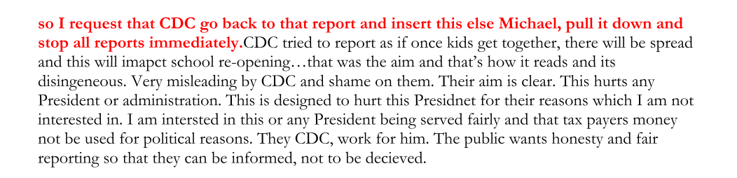 亞歷山大在郵件中寫道:“疾控中心的報告具有誤導性,我替他們感到羞恥。疾控中心發佈這樣的報告只是為了攻擊總統或者聯邦政府。如果這份報告要想出版,必須經過我的同意。我會對報告的內容進行調整,確保是公正、公平和完整的。”