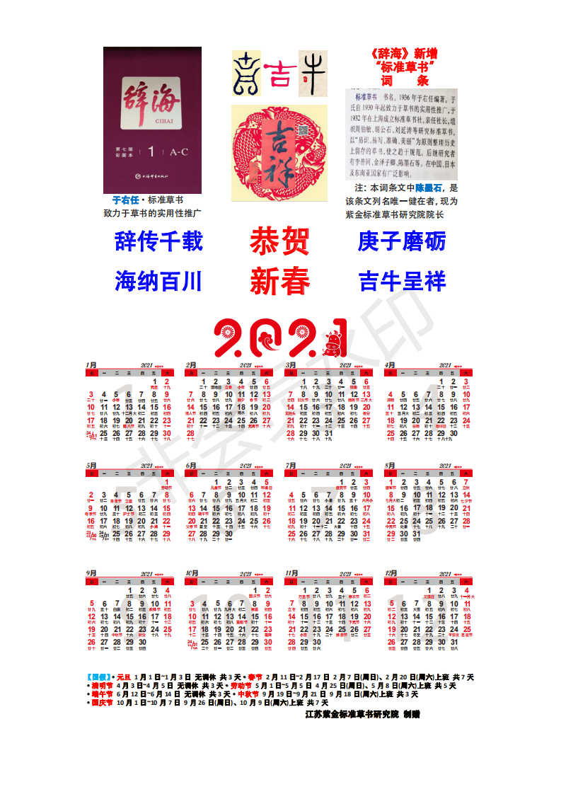過去的庚子年,可以説世界經受磨礪。但“寶劍鋒從磨礪出,梅花香自苦寒來”,中國在疫情磨礪中更顯其優,成為世界唯一經濟正增長的主要經濟體國家,仍收穫了發展的碩果。 而對標準草書而言,百年巨匠、近現代書法大師、晚年身在台灣但心心念念“望大陸”的于右任先生所創立的“標準草書”,在庚子年也收穫了可喜成果:新版《辭海》,增列了“標準草書”詞條。 在該詞條中,對“標準草書”以辭典用語做了如下的説明和記述: “於氏自1930年起致力於草書的實用性推廣,於1932年在上海成立標準草書社,親任社長,組織周伯敏、胡公石、劉延濤等研究標準草書,以‘易識、易寫、準確、美麗’為原則整理歷史上留存的草書,使之區域規範。後繼研究者有李普同、金澤子卿、陳墨石等。在中國、日本及東南亞國家有廣泛影響。” 正所謂“辭傳千載,海納百川”。“標準草書”詞條收入《辭海》,對大眾進一步認知標準草書,對標準草書的“實用性推廣”,必將發揮重要的影響和作用。此贈簡制電子版吉牛標草2021年曆(附國假日)——外間所供年曆,多無“國假”,此宜便查。