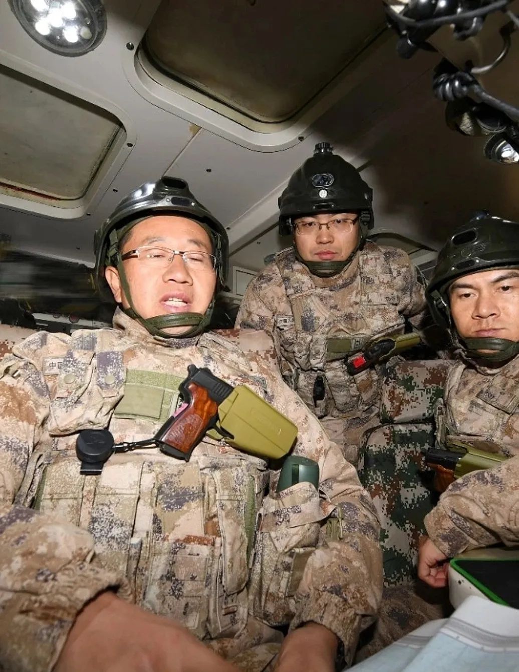 近日,小二在逛微博的時候,突然發現了近期官宣的一張指揮車內指揮訓練的照片,圖中的新型星空迷彩我們已經看了很多了,不過車內幾名指戰員胸前快拔槍套中的手槍引起了小二注意,黑色的槍身,配上了實木色握把貼片,看起來十分復古。
