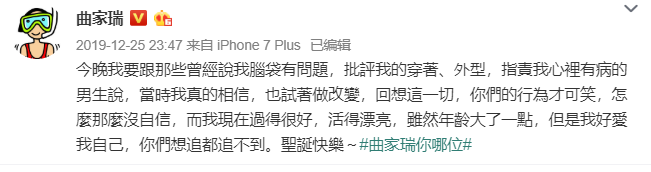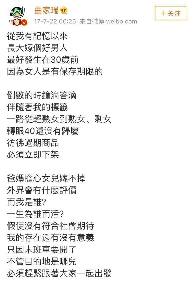 在微博上,曲家瑞的言論被很多女孩追捧,因為她的話總能帶給很多獨身女性力量。她像是一個情感導師,耐心的和網友交流溝通,答疑解惑。