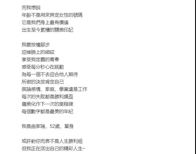 在52歲生日那天,曲家瑞在微博上分享了自己的感悟。她説:”年齡不是界定女性的號碼,它是我們身上最有價值,出生至今累計的驕傲印記。”