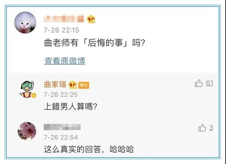 當粉絲問她:”有沒有做過什麼後悔的事情?“她在評論區直率的回覆到:”上錯男人算嗎?“