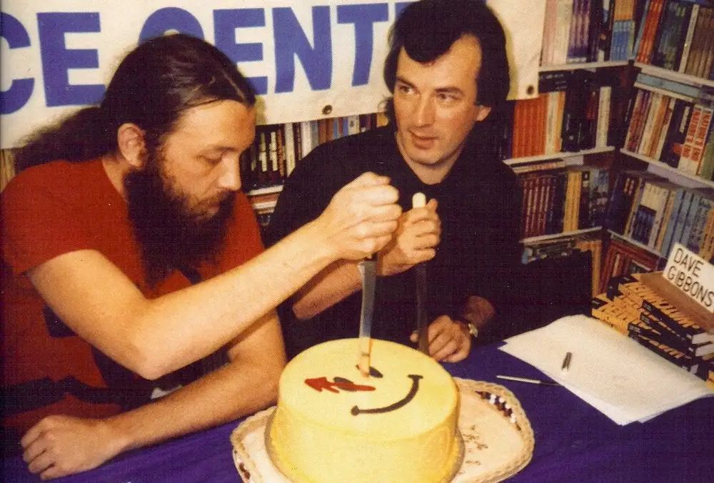 摩爾(左側)與之後共同創作《守望者》的畫師戴夫·吉本斯自2000AD時期就開始了合作(圖為二人慶祝《守望者》發行)