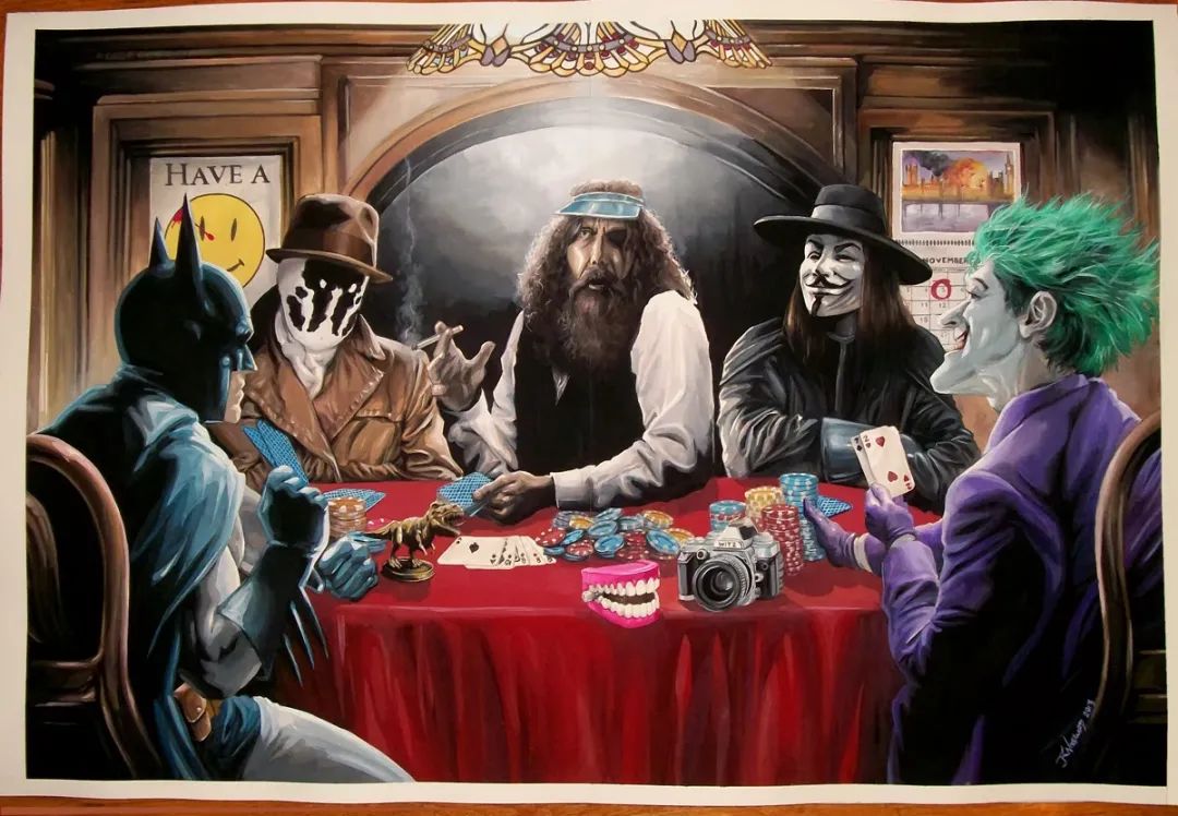 摩爾和他筆下的人物們(《守望者》中的羅夏,《V字仇殺隊》中的V,《致命玩笑》中的蝙蝠俠和小丑)
