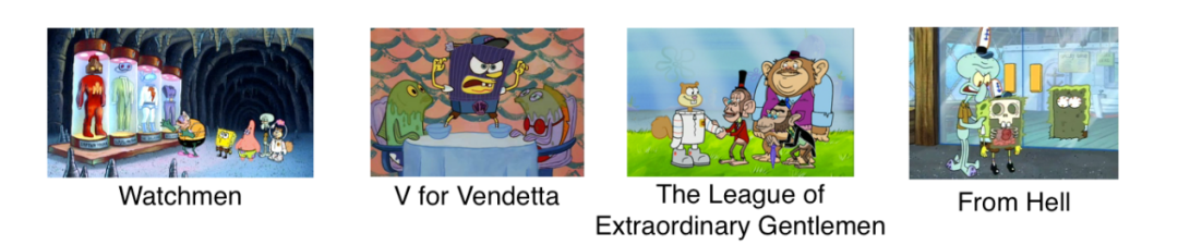 海綿寶寶版本的摩爾漫畫場景復刻,分別來自《守望者》《V字仇殺隊》《超凡紳士聯盟》《來自地獄》(從左至右)